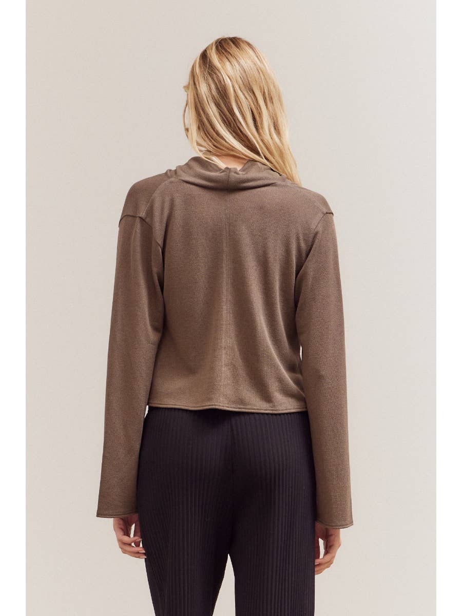 Super soft cropped cowl neck loose fitting top in the color mocha.
