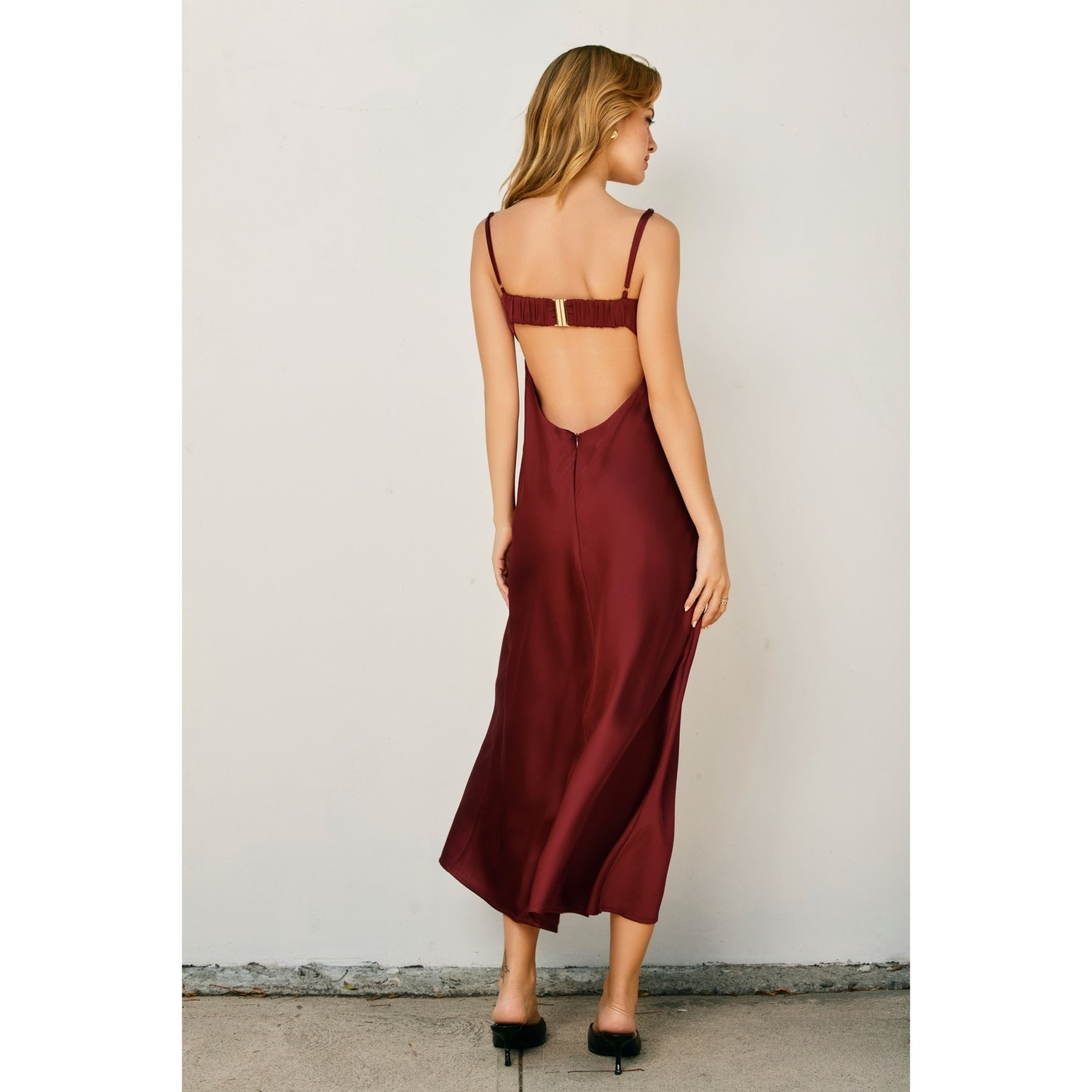 Satin flare midi dress with lace trim detailing, back clasp closures, spaghetti straps, lace sweetheart neckline, and a hidden back closure with a hook and eye closure. Partially lined.