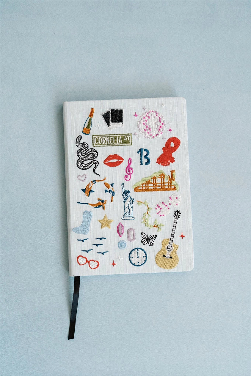 This 5.5x8x8 inch linen hardcover journal features embroidered icons representing TS songs and eras! The Snake, Polaroid, Midnight's clock, Debut guitar, the Red scarf and more are beautifully embroidered onto the light sea foam cover. The journal features lined pages and a ribbon bookmark.