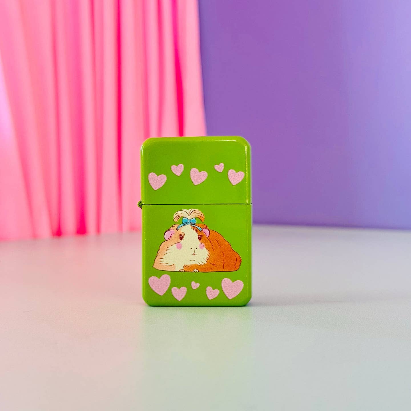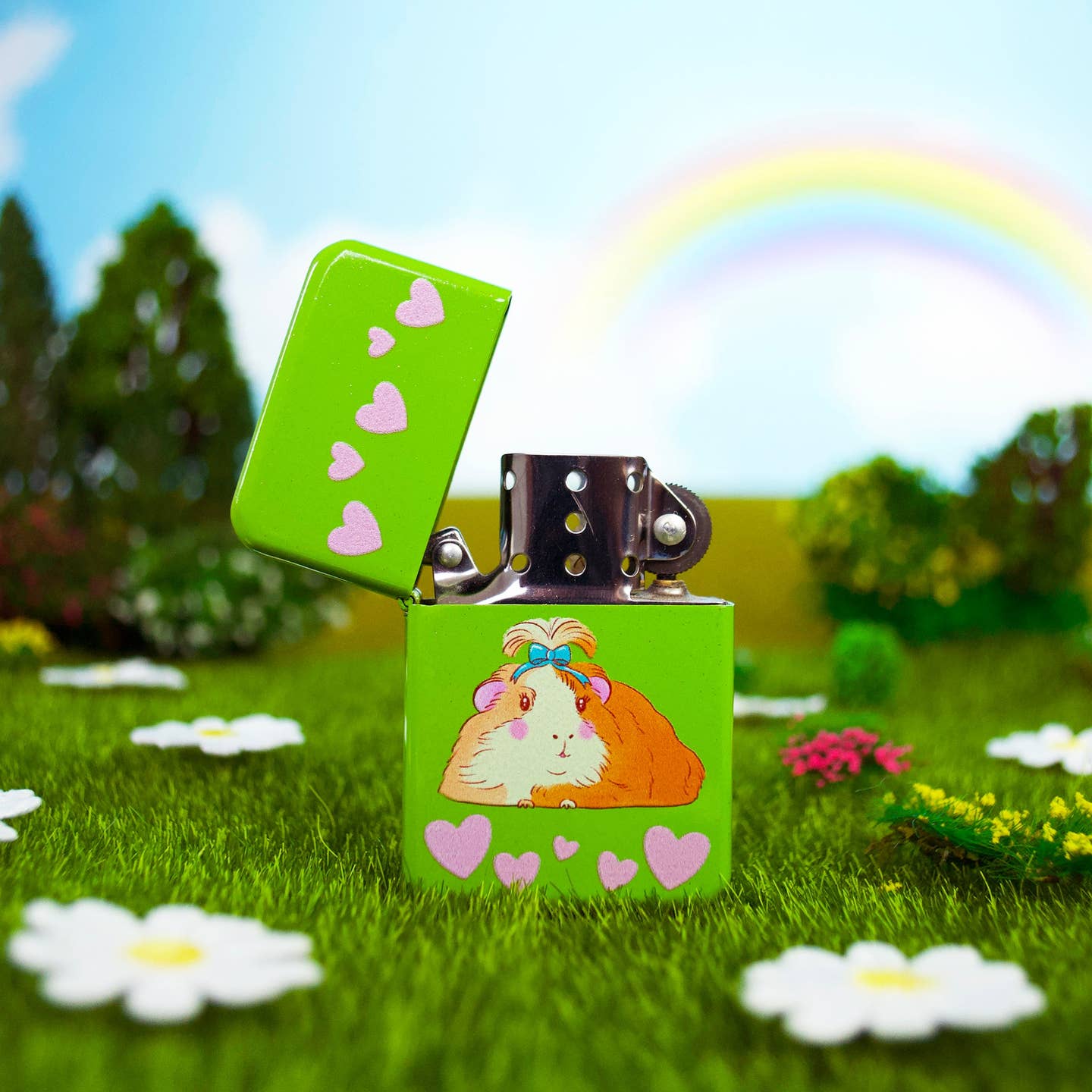 Just. Look. At. How. CUTE! This lighter features the sweetest illustration of a guinea pig wearing a blue bow surrounded by hearts. Art drawn by the talented Claire Shadomy! The lighter itself is green with a slight glittery shine. These lighters are REFILLABLE! Lighter fuel not included. Lighter ships empty and needs to be filled with lighter fluid to ignite! View our tutorial on how to fill this lighter here! The casing is a high quality metal. This is a product you can use over and over and will last you for life if taken care of properly! They are very similar to Zippo lighters and can be filled and re-filled the same way.