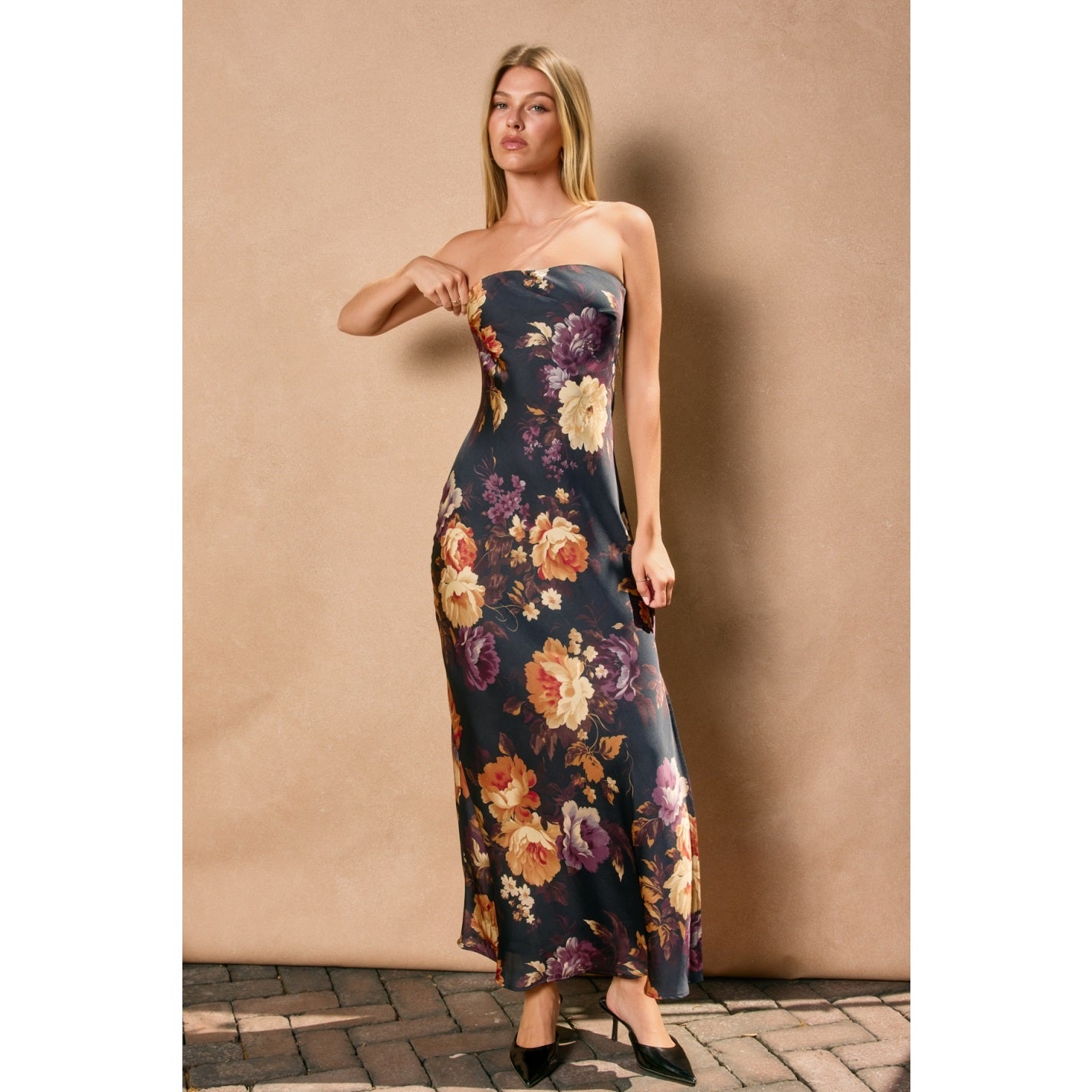 Floral print chiffon strapless maxi dress with elastic band with gel grip tape on the neckline, pull on design, slight stretch from the bias cut and side slit. Dress is lined.