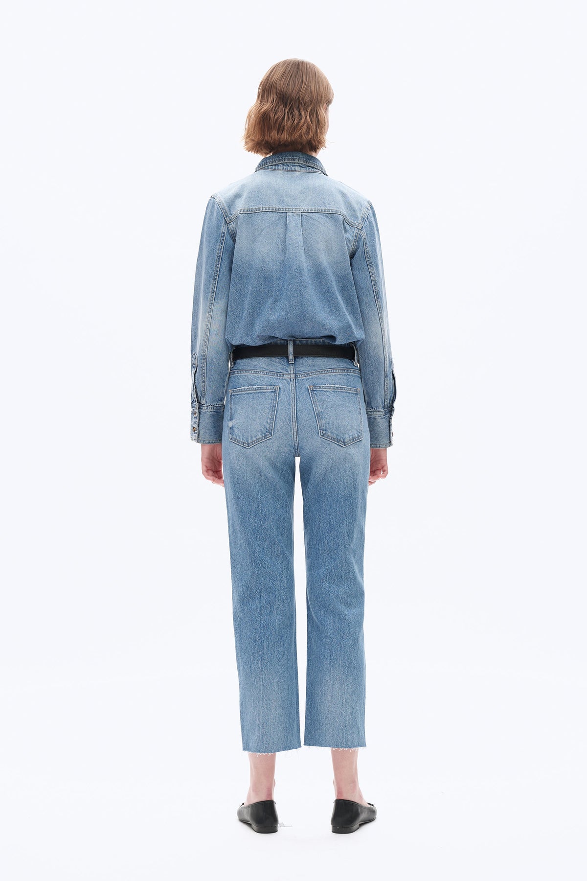 Classic straight-leg denim with a flattering high-rise fit and raw hem detail, perfect for versatile everyday styling.