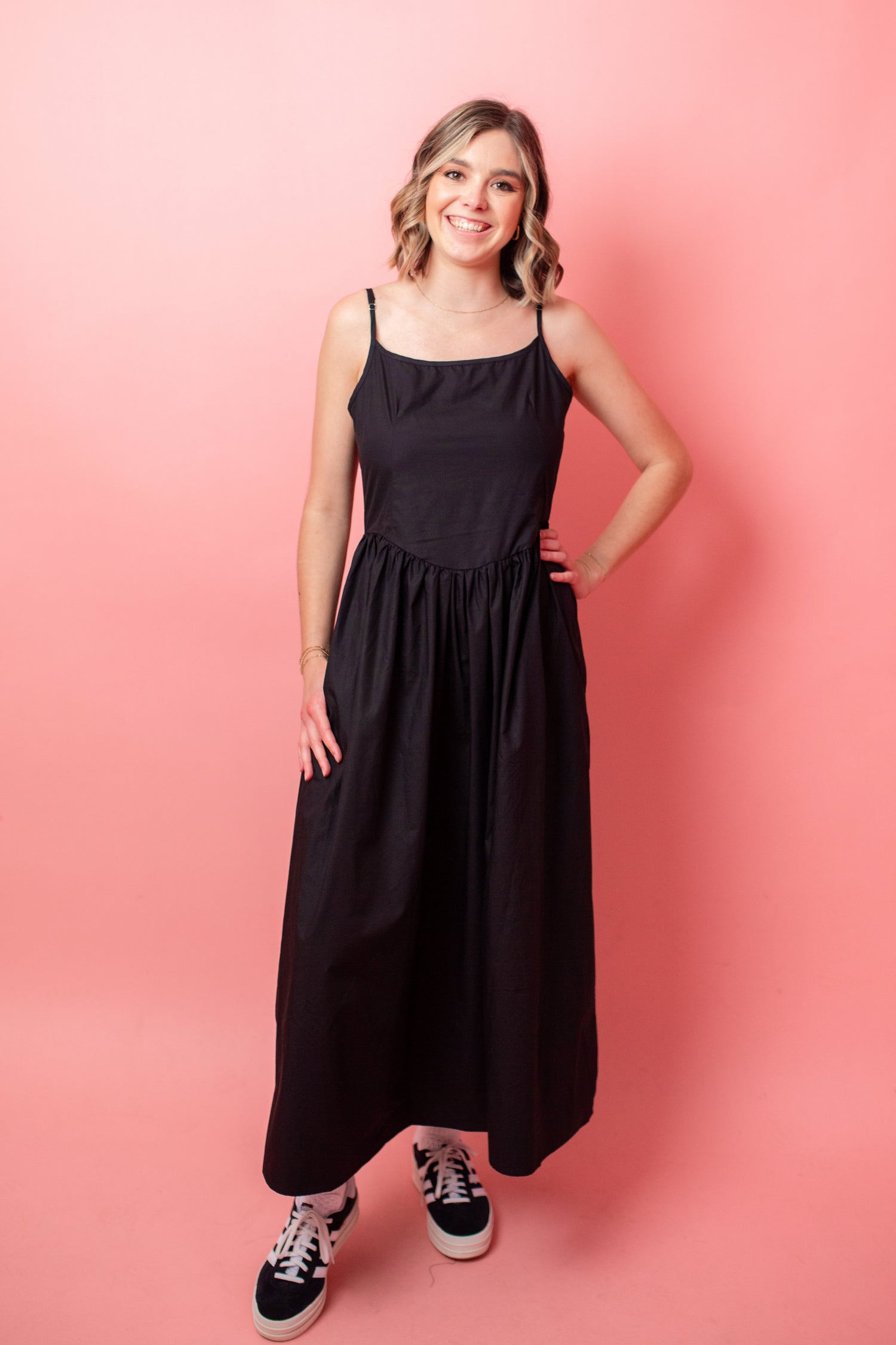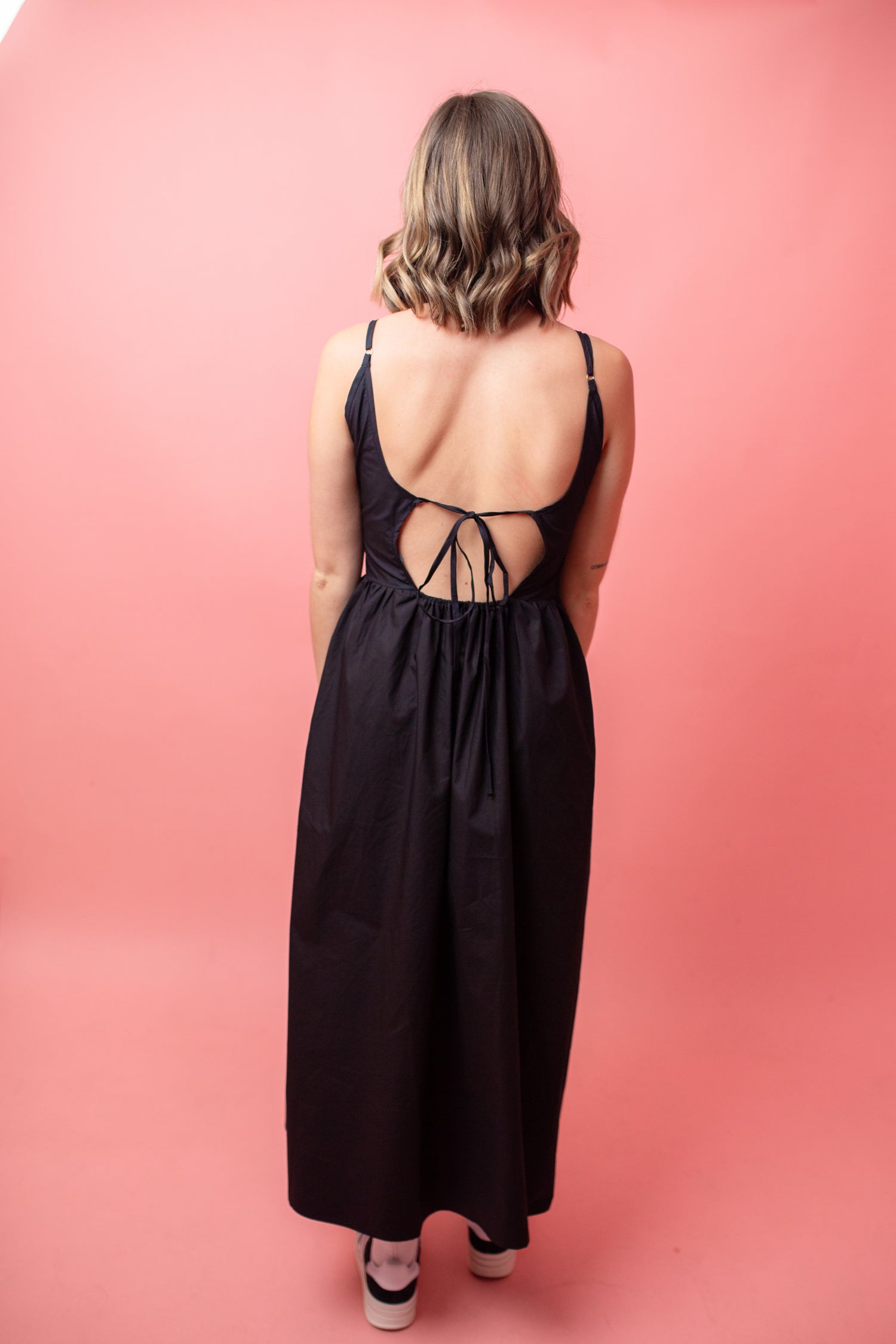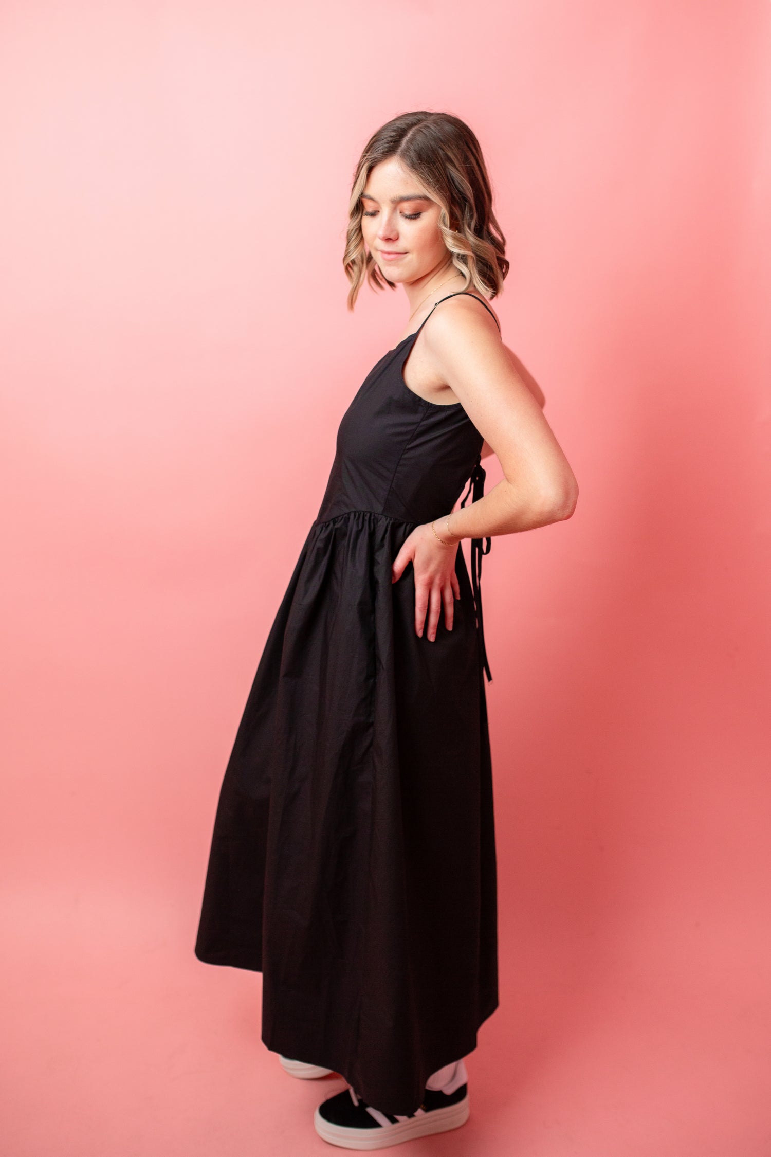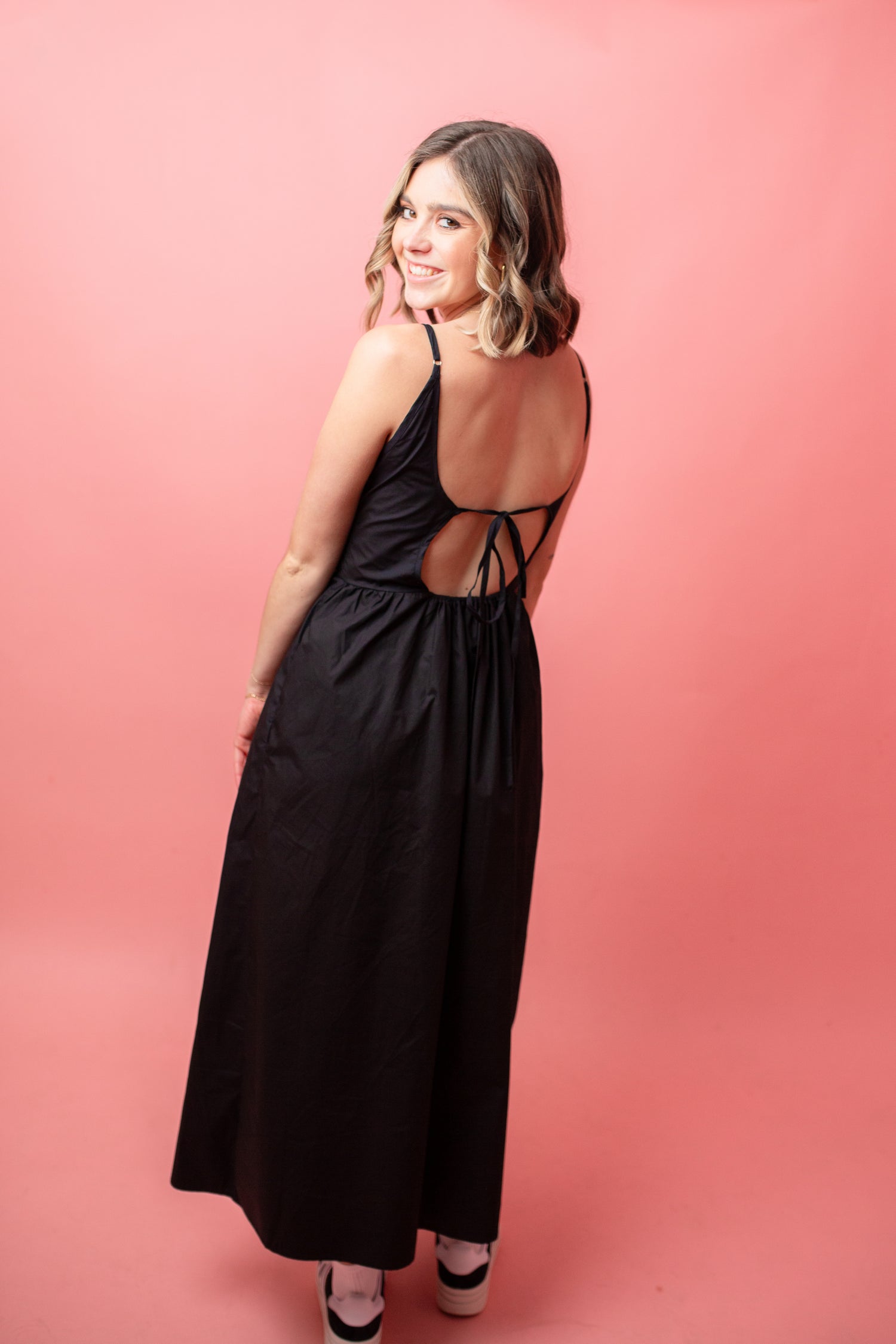Full maxi dress featuring a pleated waistline, with adjustable straps, and a tie closure open back.