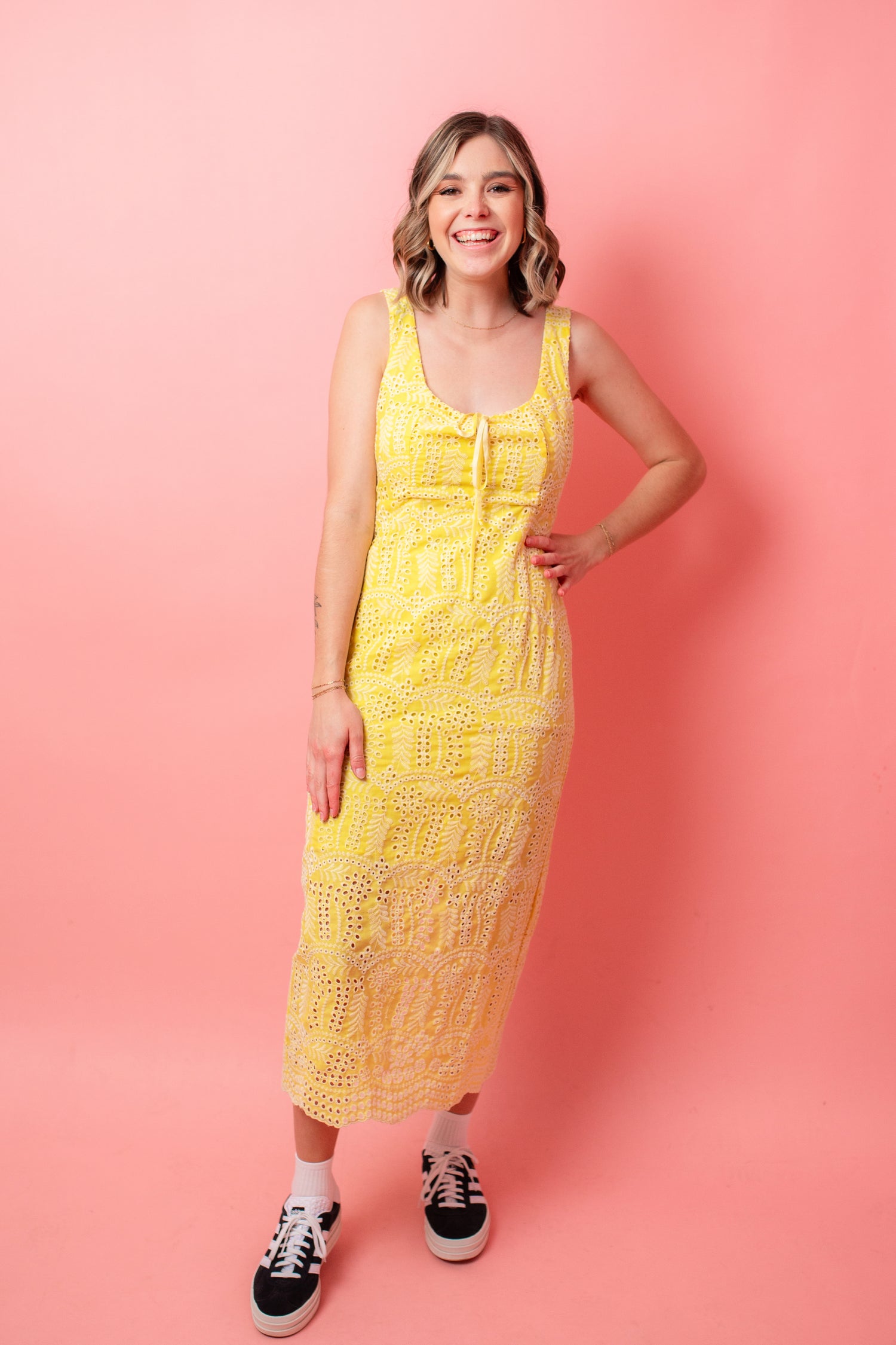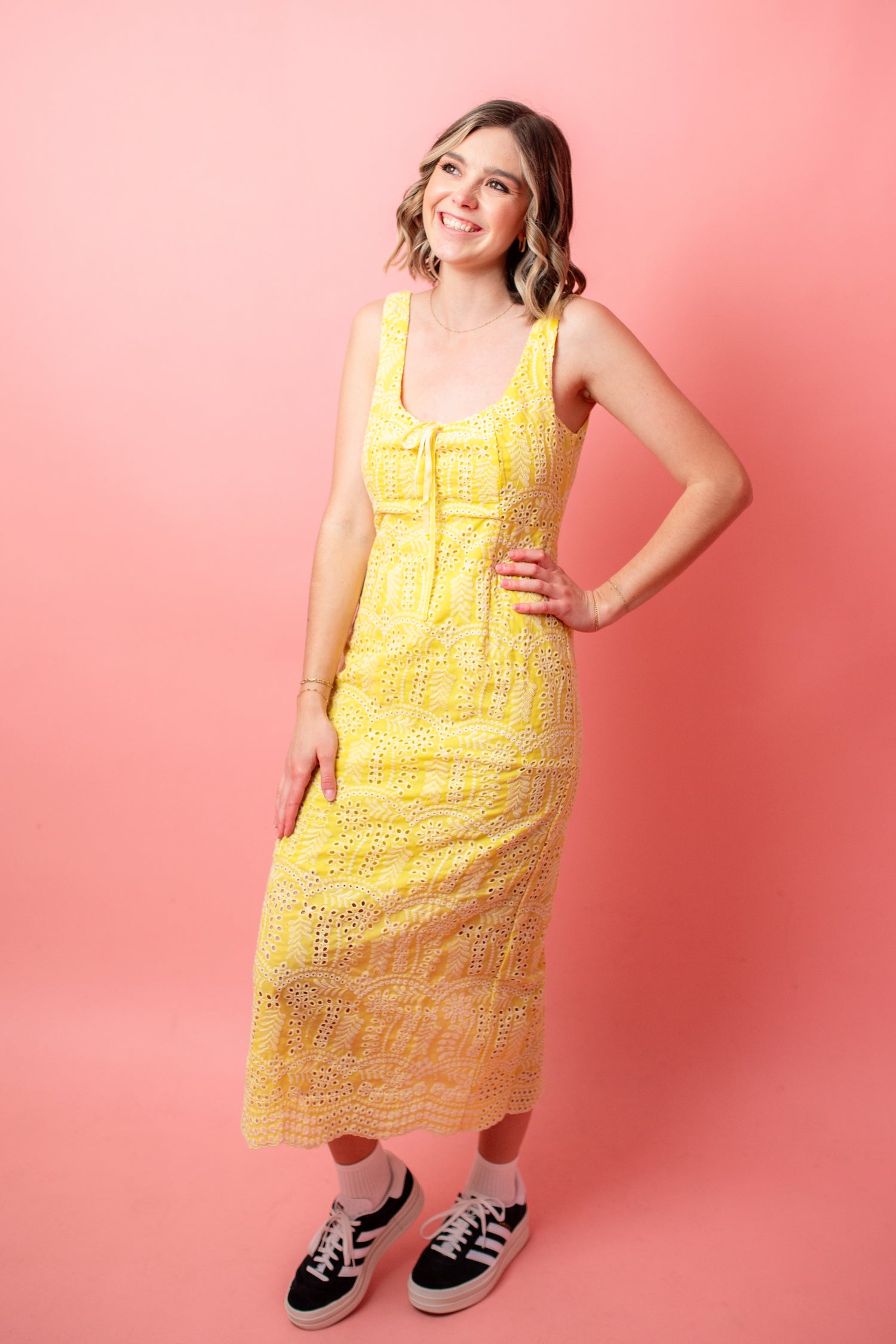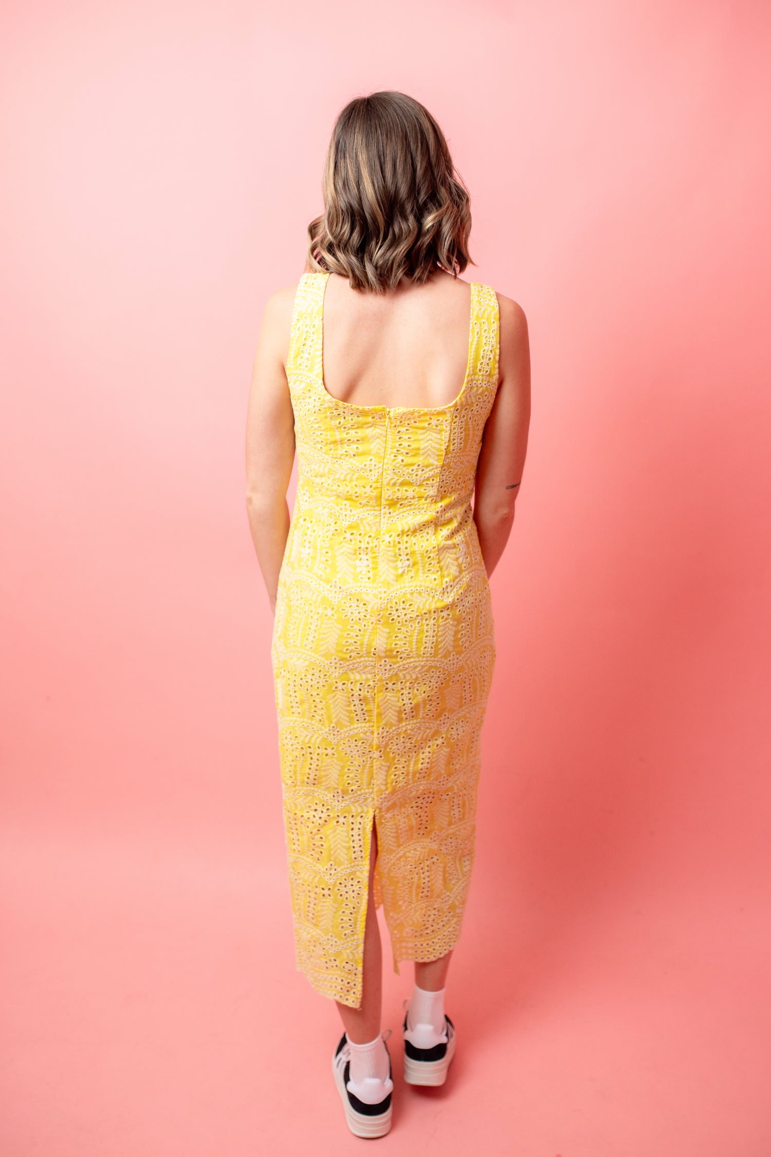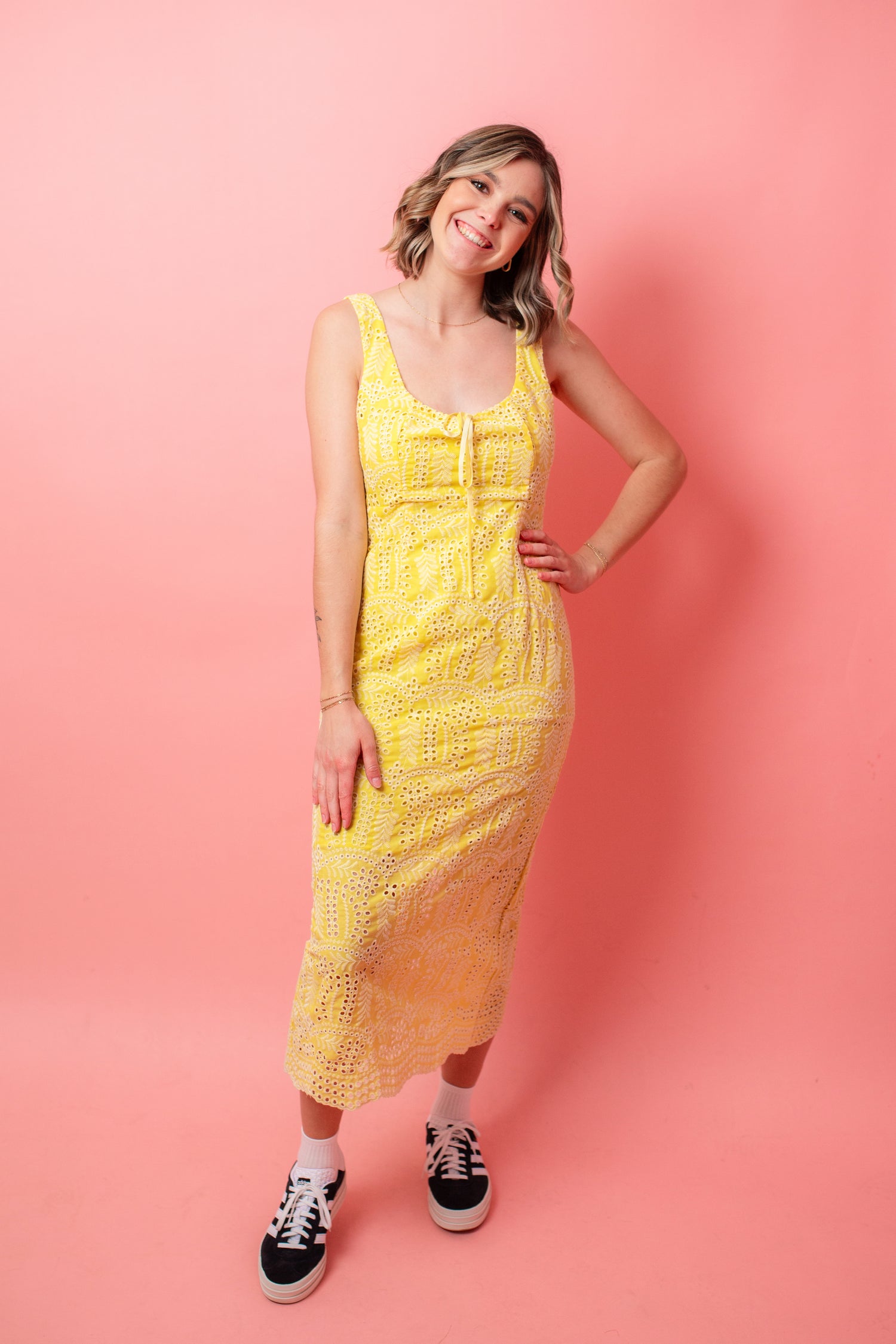 Add some zest to your wardrobe with our Lemon Drop Maxi Dress. Feminine and chic, this dress features a bright yellow hue in a cotton eyelet fabric. Perfect for weddings or brunches, with an invisible back zipper and sleeveless cut for a romantic touch.