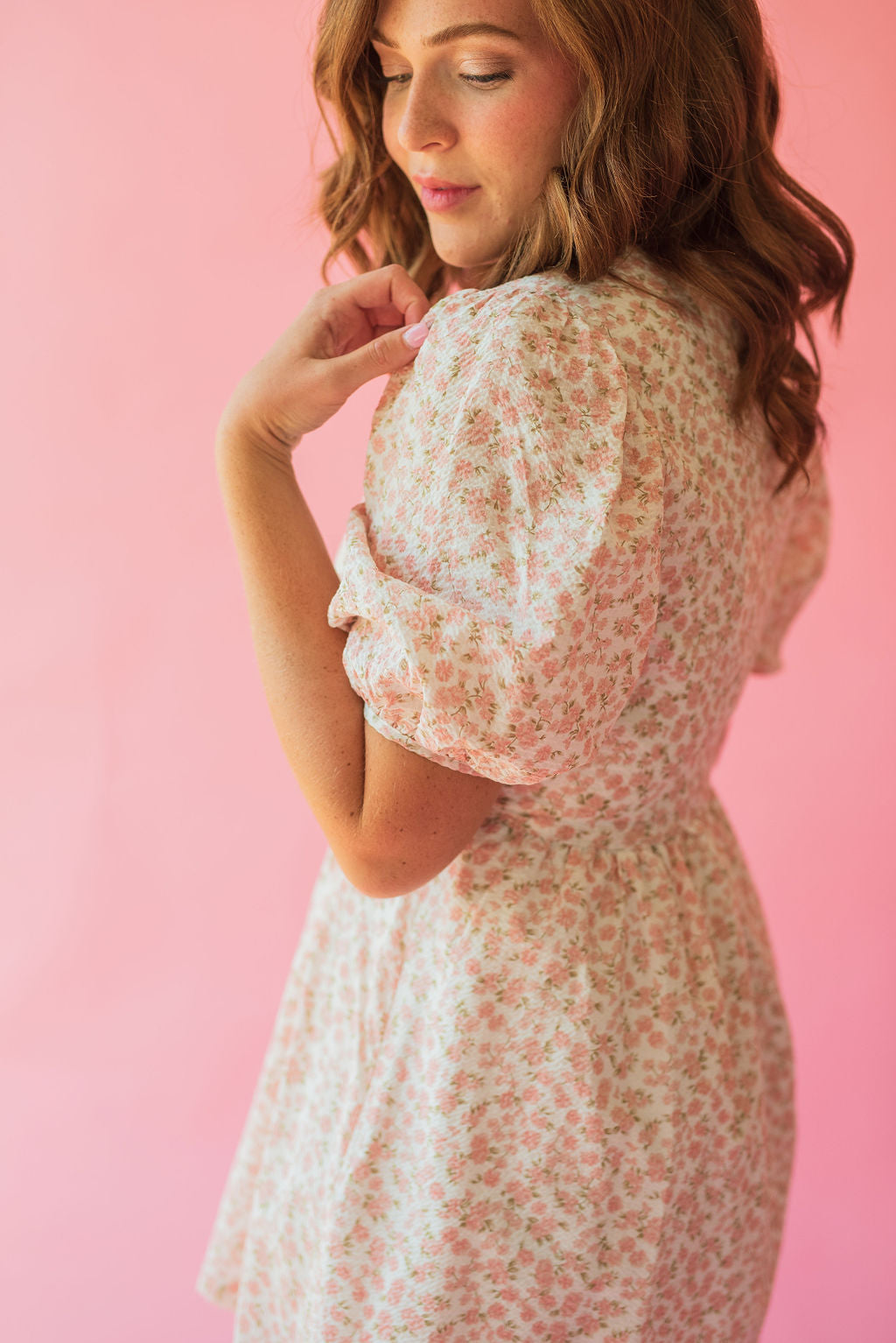 Mini style dress featuring an elastic waistline and cut out. Light pink floral bouquets with a cream background and puff sleeve detail. Fully lined, mock neck, and zipper closure at the back.