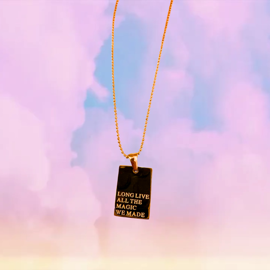 Custom Keepsake Necklace with "Long Live All The Magic We Made" engraved on it.