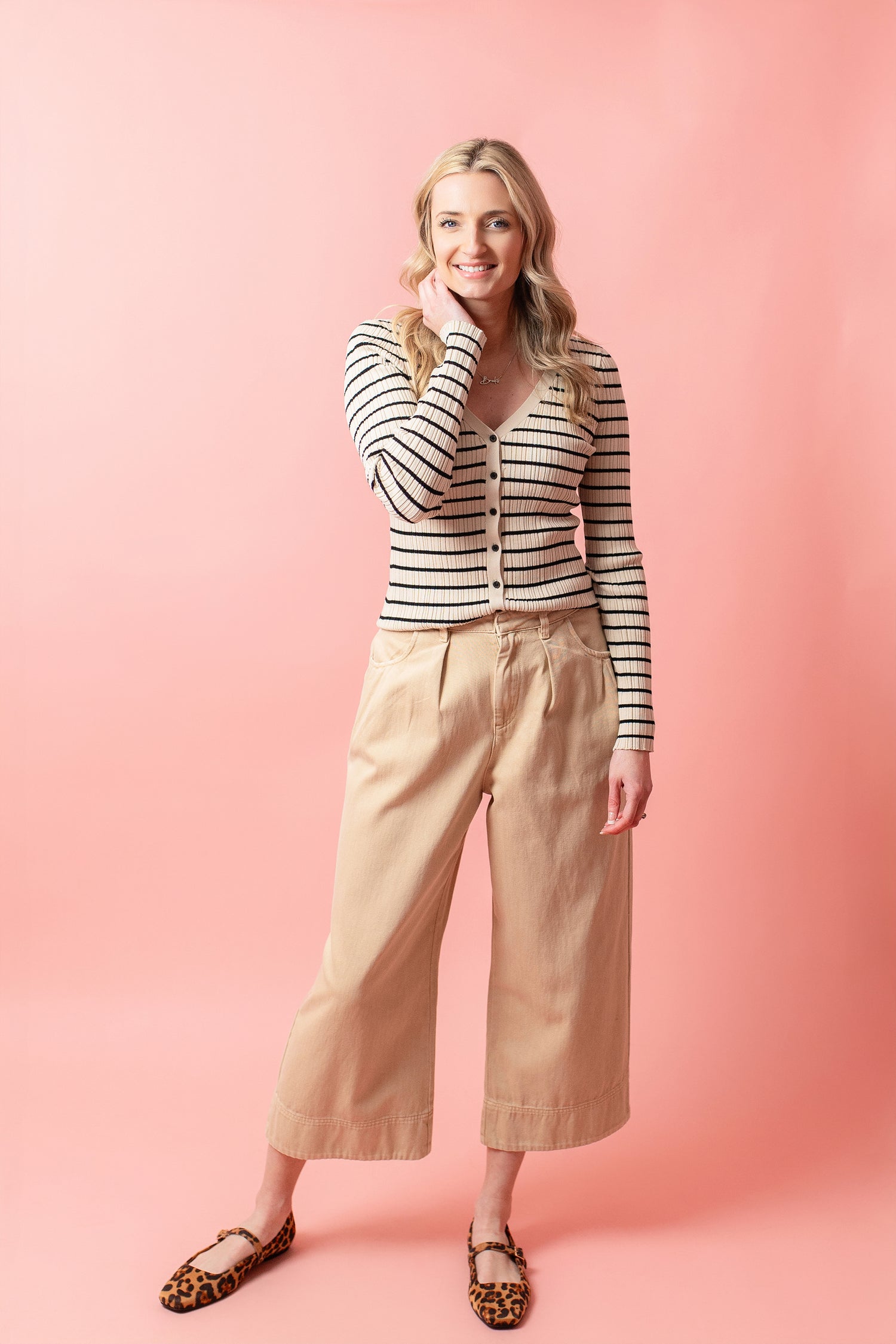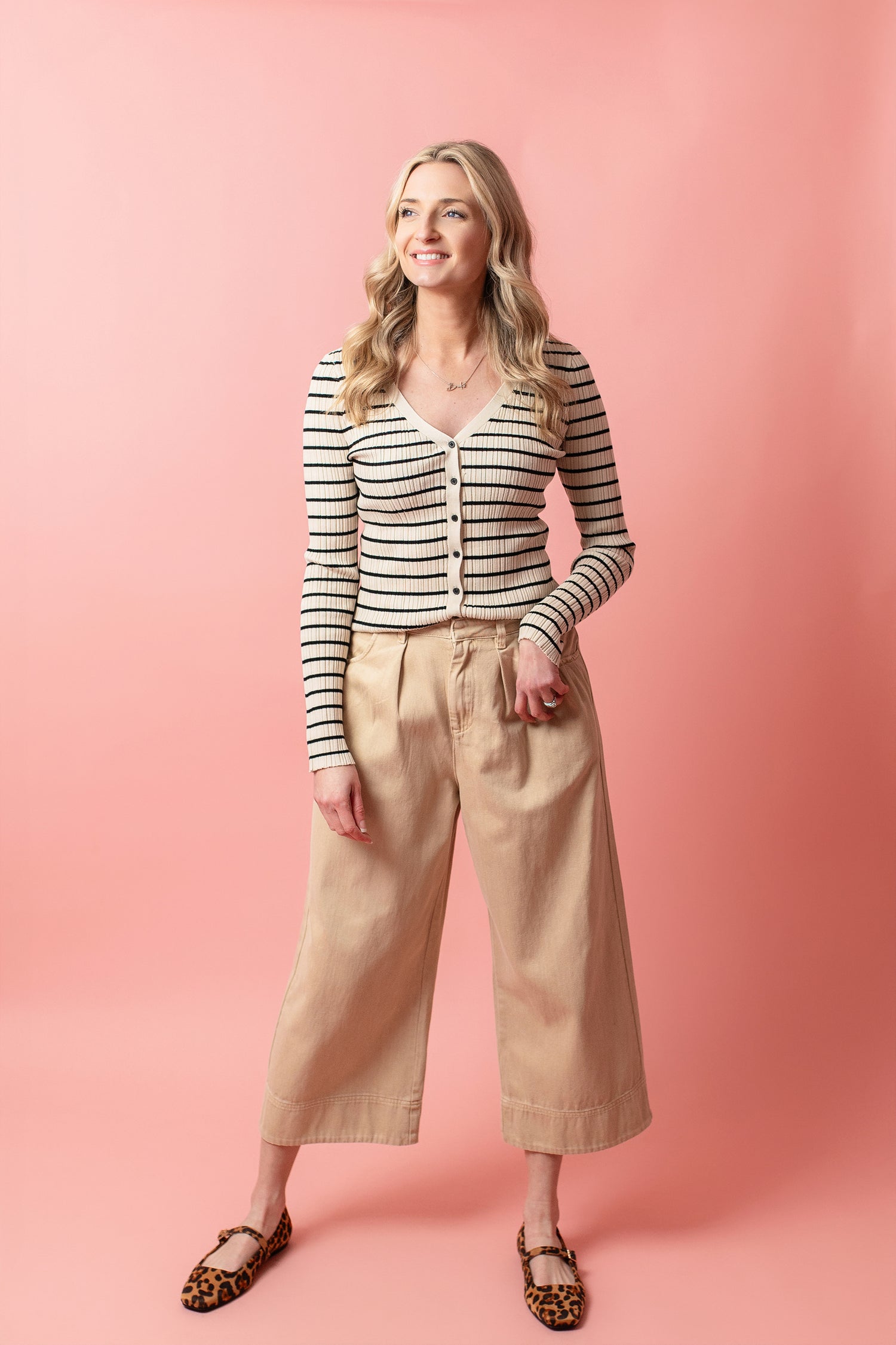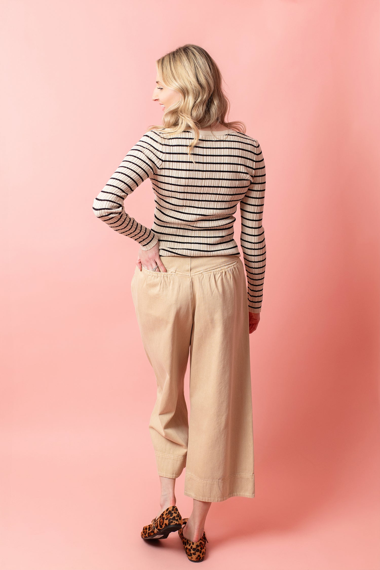 Natural ecru wide leg pants featuring ruched pockets at the front and back. Button and zip fly closure.