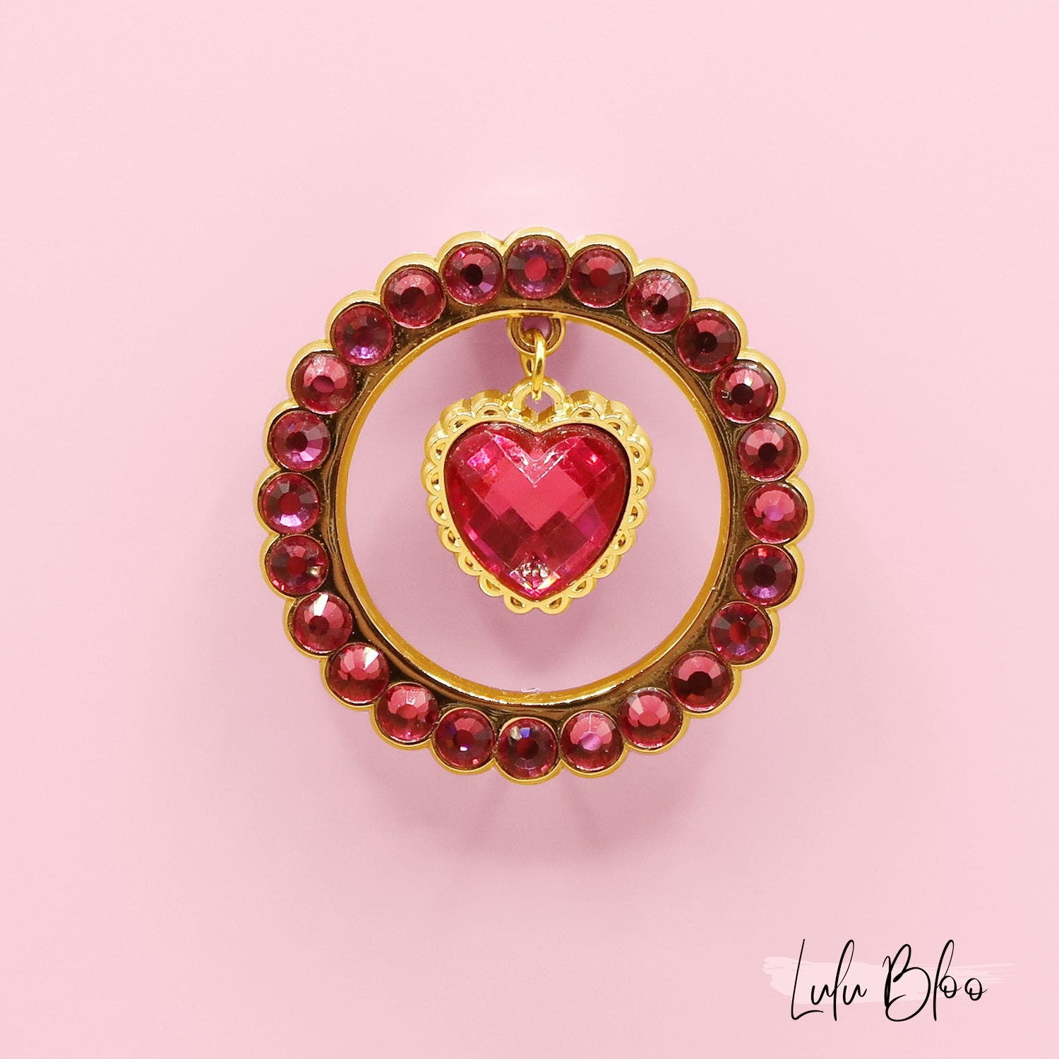 This oh so adorable pin features a circle wreath of pink crystals and a dangling pink crystal heart with a scallop trim. It’s the perfect accessory!
