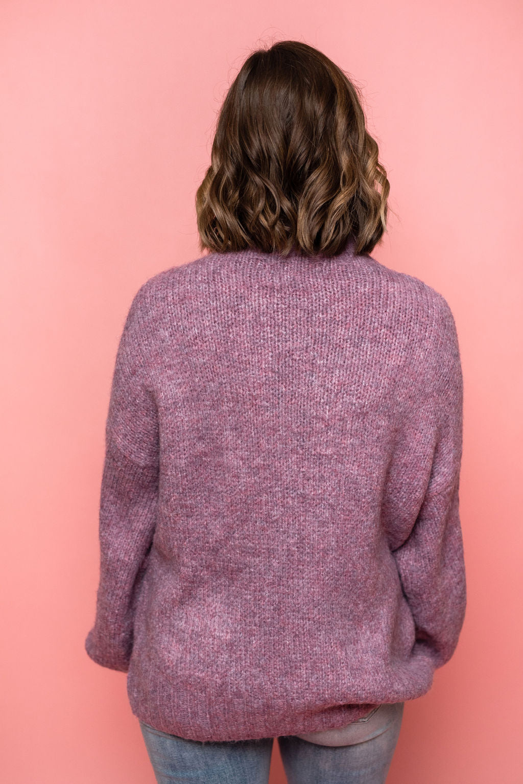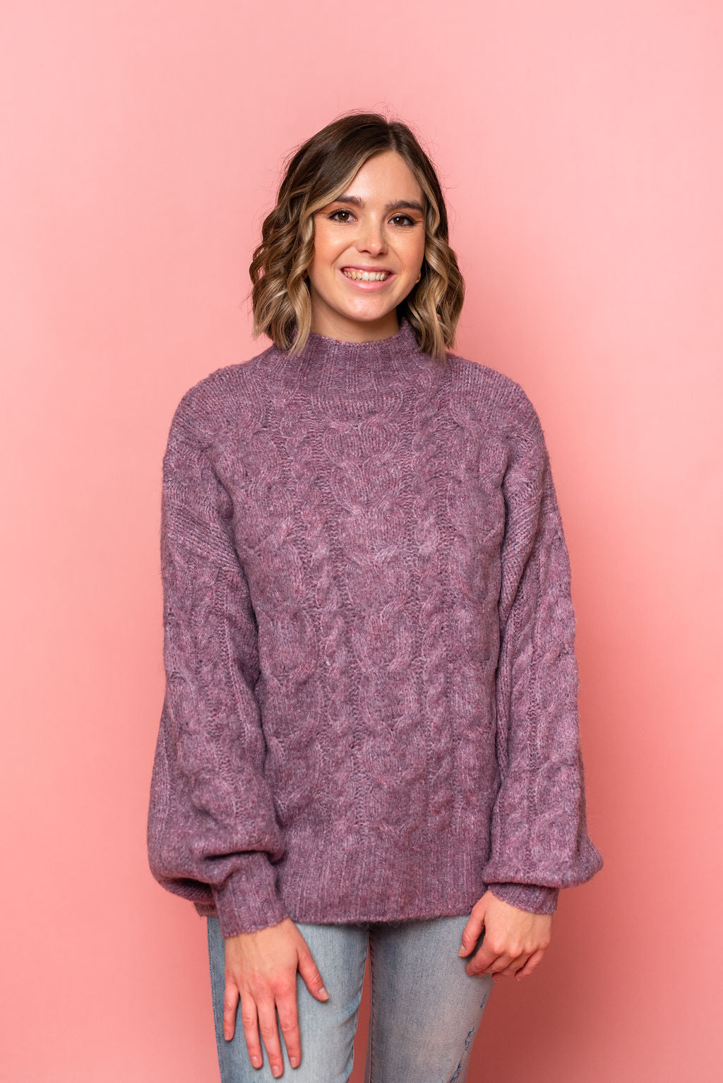 Oversized cable knit sweater in a soft lilac, with a mock neck and wide sleeves.