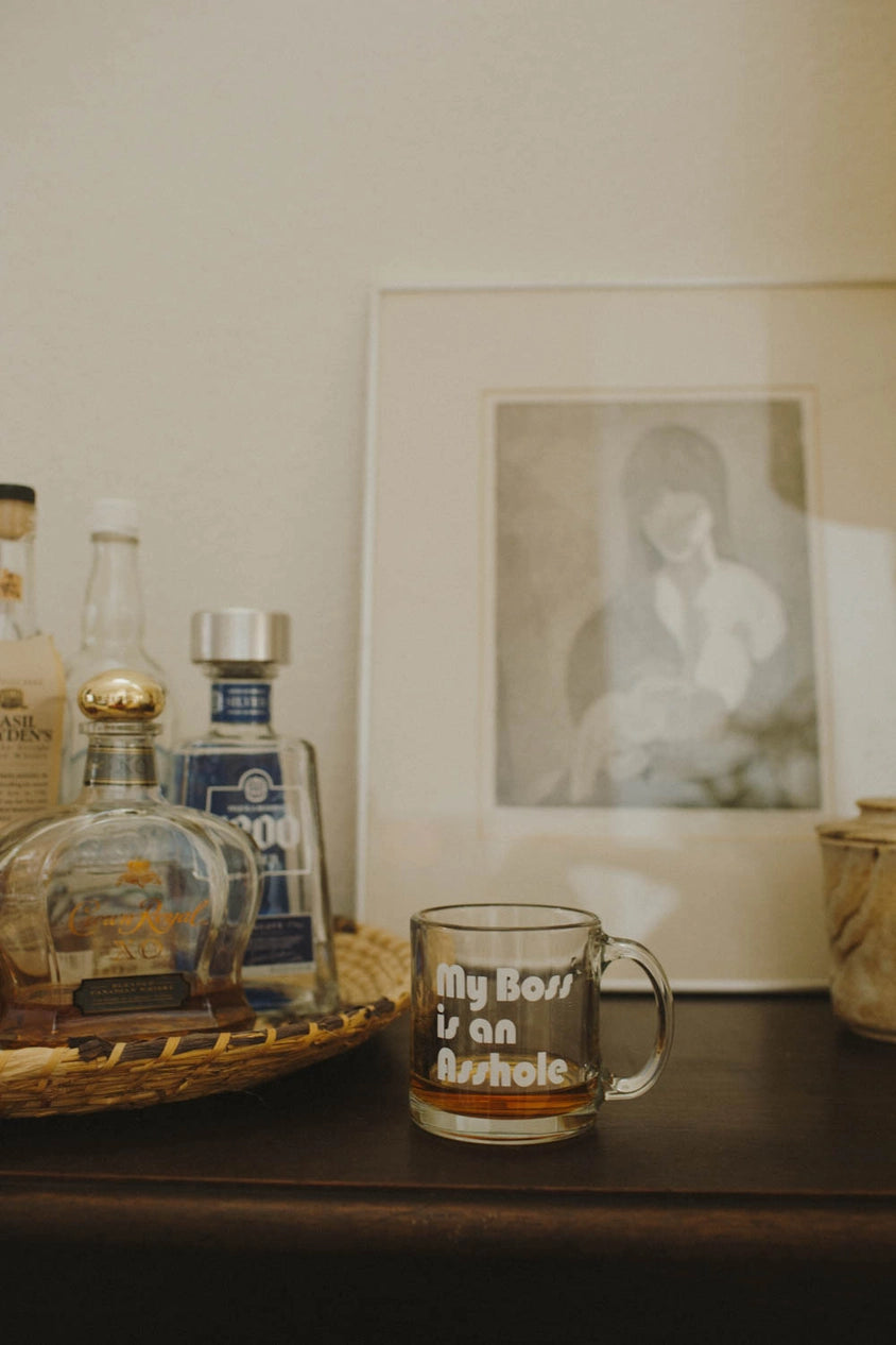 13oz Clear glass coffee mug Tell it like it is. Now offering front + back printing so your message is clear no matter how full your glass. Bottoms up.