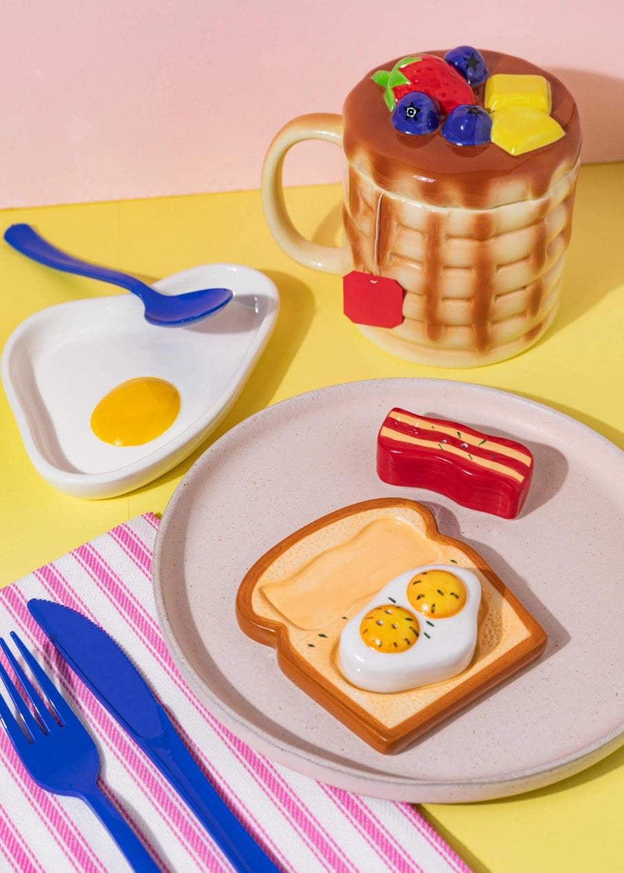 This pancake shaped mug is finished with beautiful embossed details that look just like a real stack of pancakes with fruit and butter on top. The separate lid is great for brewing your tea or keeping your drink warm. Made with ceramic and finished with a food safe glaze. Dishwasher safe. Holds 16 oz. 4.5" tall x 4" diameter.