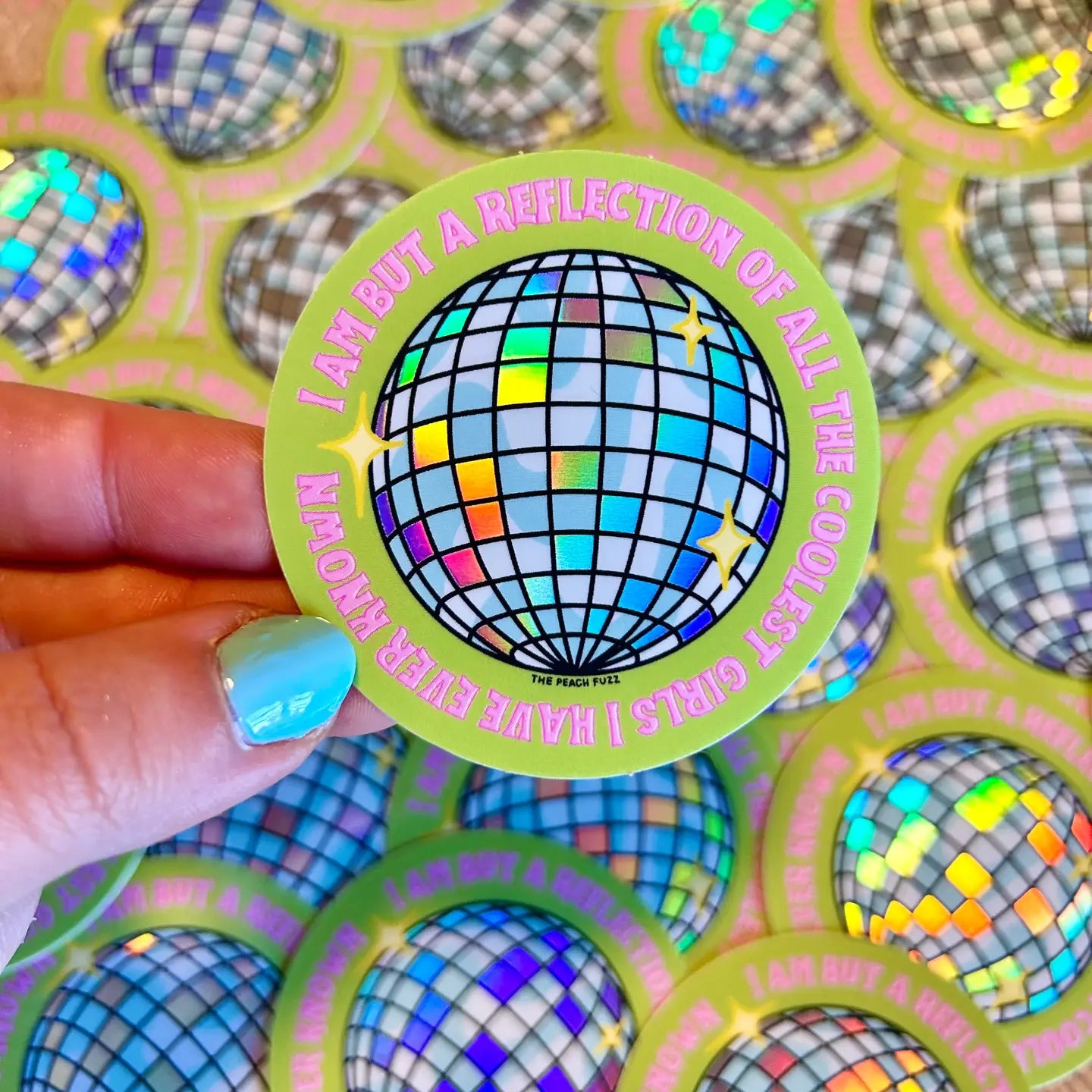 Vinyl water resistant sticker with glossy finish and glitter detail. Measures 2.4 x 2.4 inches featuring a disco ball with holographic details and text surrounding the disco ball reading "I am but a reflection of all the coolest girls I have ever known". Materials and Care: ✿ fully waterproof ✿ Feature UV screening to protect against weather and sunlight ✿ 2-4 year minimum outdoor life Perfect sticker for your laptop, water bottle, notebook, and even your car!