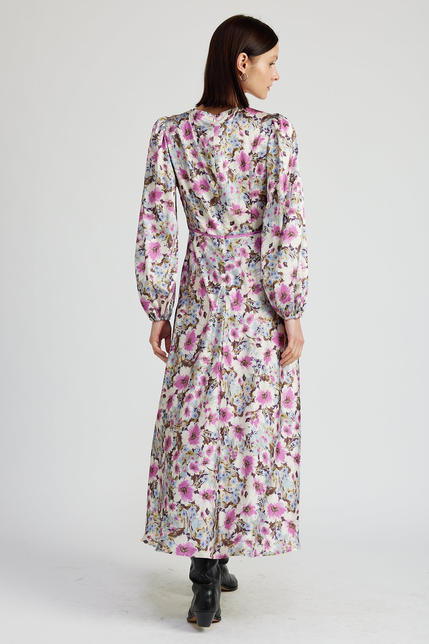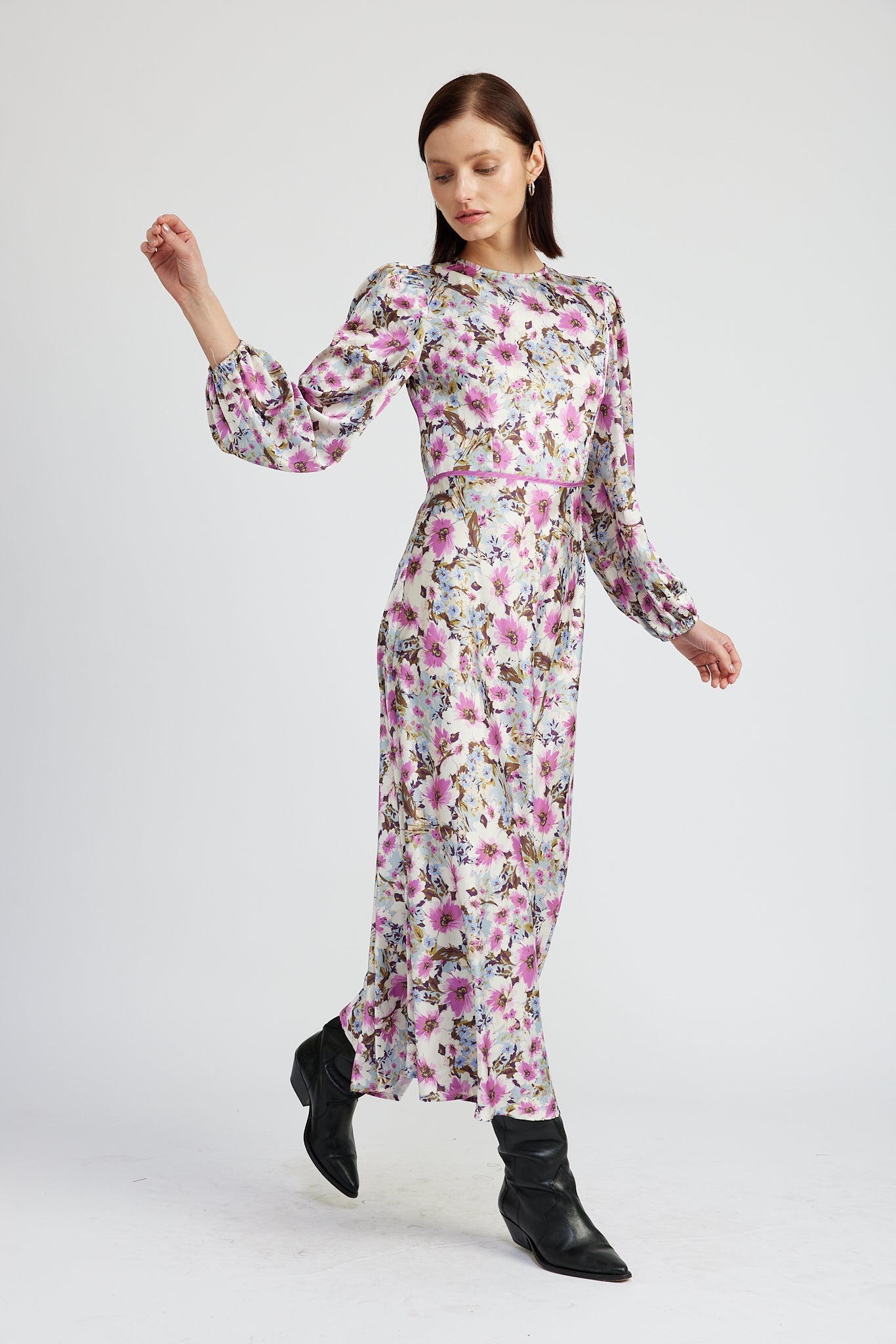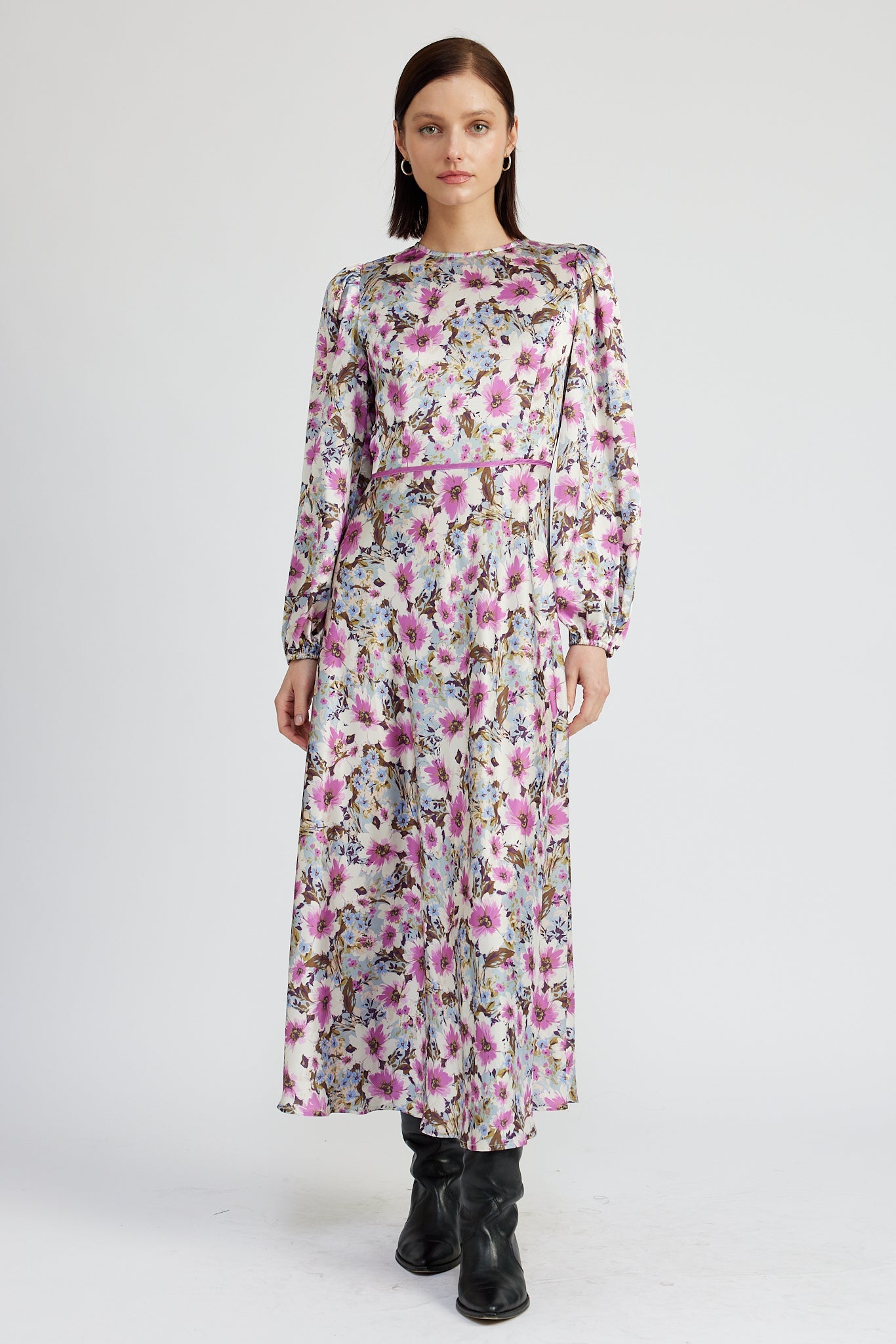 Satin floral print dress with long sleeve and a dropped waist skirt and accent trim detailing.