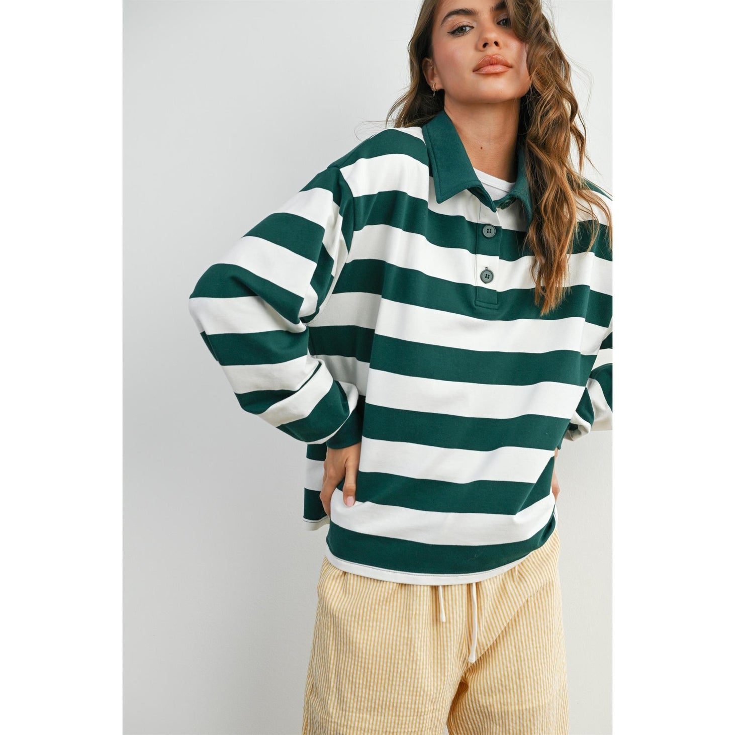 This sweatshirt features a collared neckline with a quarter-button placket for a sporty yet polished look. Designed with bold stripes and a relaxed fit, it combines comfort with casual style. Perfect for layering or wearing on its own for an effortlessly laid-back outfit.