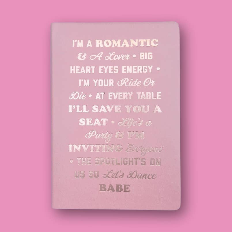 Pink Vegan Leather Bound Foil Pressed Cover Approximately 5.75" x 8.25" 160 Dotted Pages 70lb Paper Stock Ribbon Bookmark Pocket on inside back cover for all your cool shit and secrets