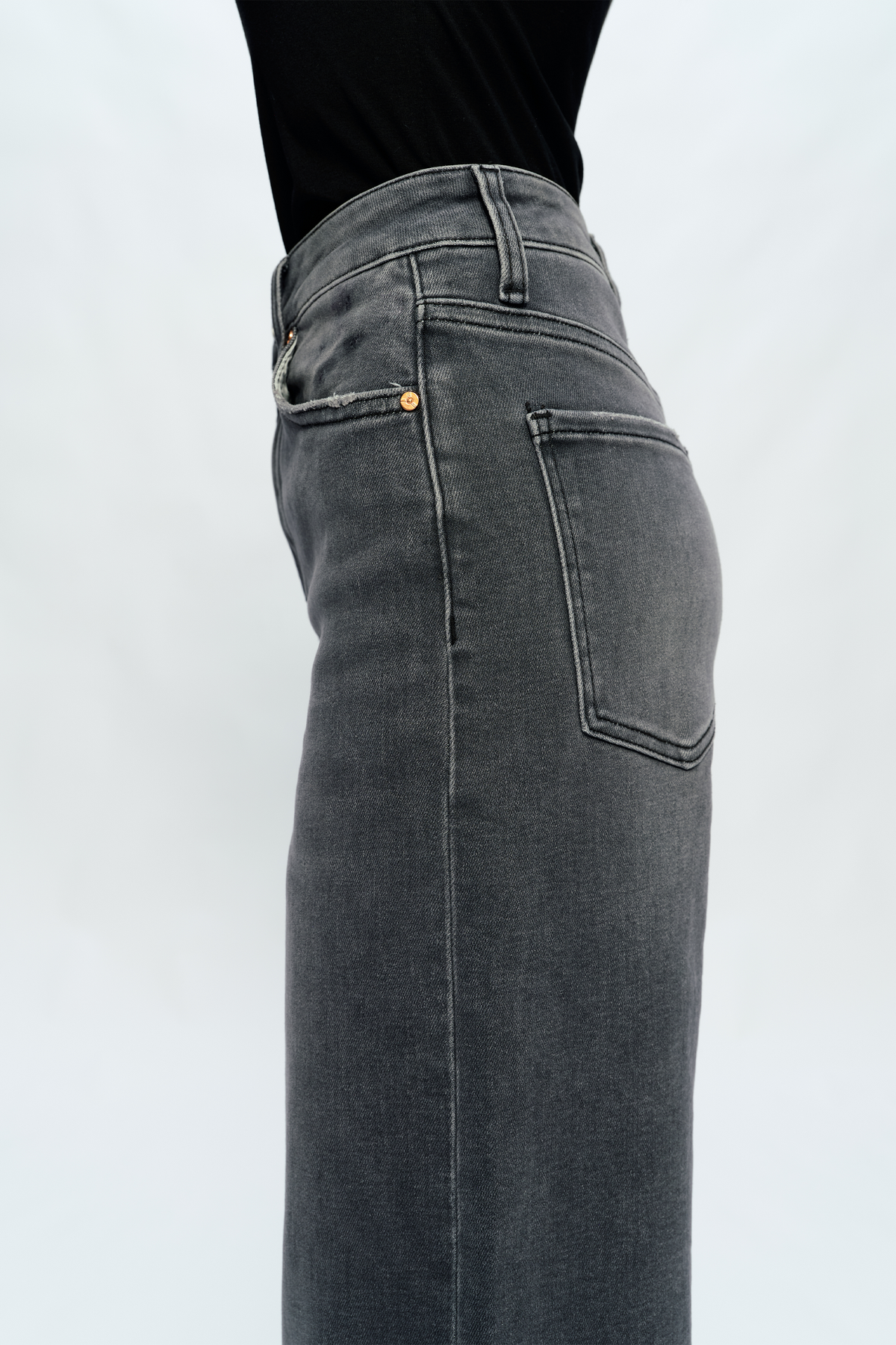 Our high-waisted wide-leg denim jeans, made from high stretch denim fabric, feature a worn-out hem and classic five-pocket design. The jeans are accented with subtle whiskering and a slightly faded wash, offering a stylish yet comfortable fit perfect for everyday wear.