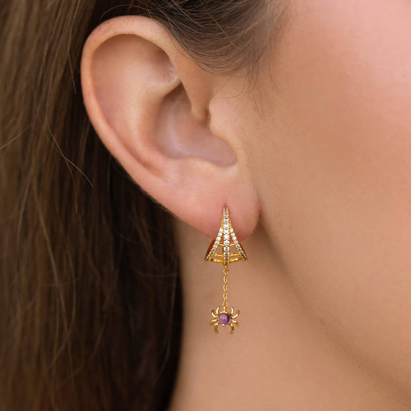 The Web of Lies Hoop Earrings are for the queen who’s equal parts mysterious and mischievous. Featuring spider web charms and tiny spiders that dance with every step, these earrings are perfect for spooky nights and everyday enigma. Warning: may cause people to get tangled in your spell.