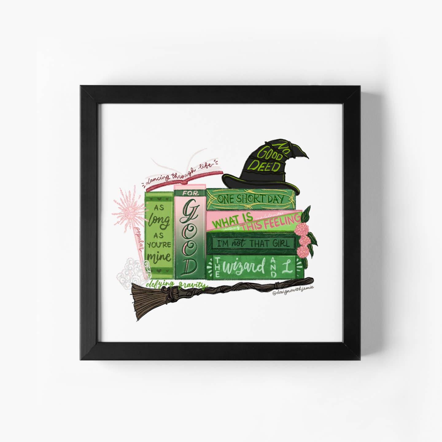 Calling all Wicked fans! Join Elphaba & Glinda in their adventures with the Wizard of Oz with this print featuring the tracklist from this iconic Broadway show & movie. 8" x 8”, 100lb cardstock. Frame not included.
