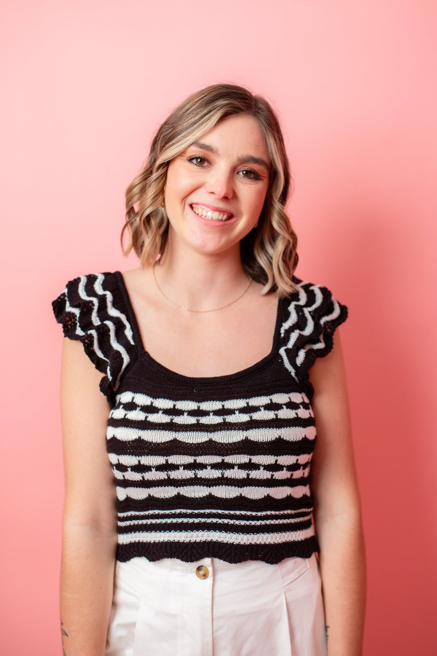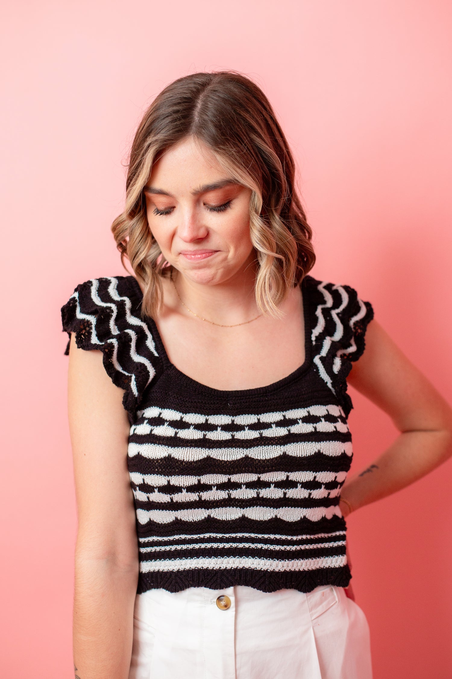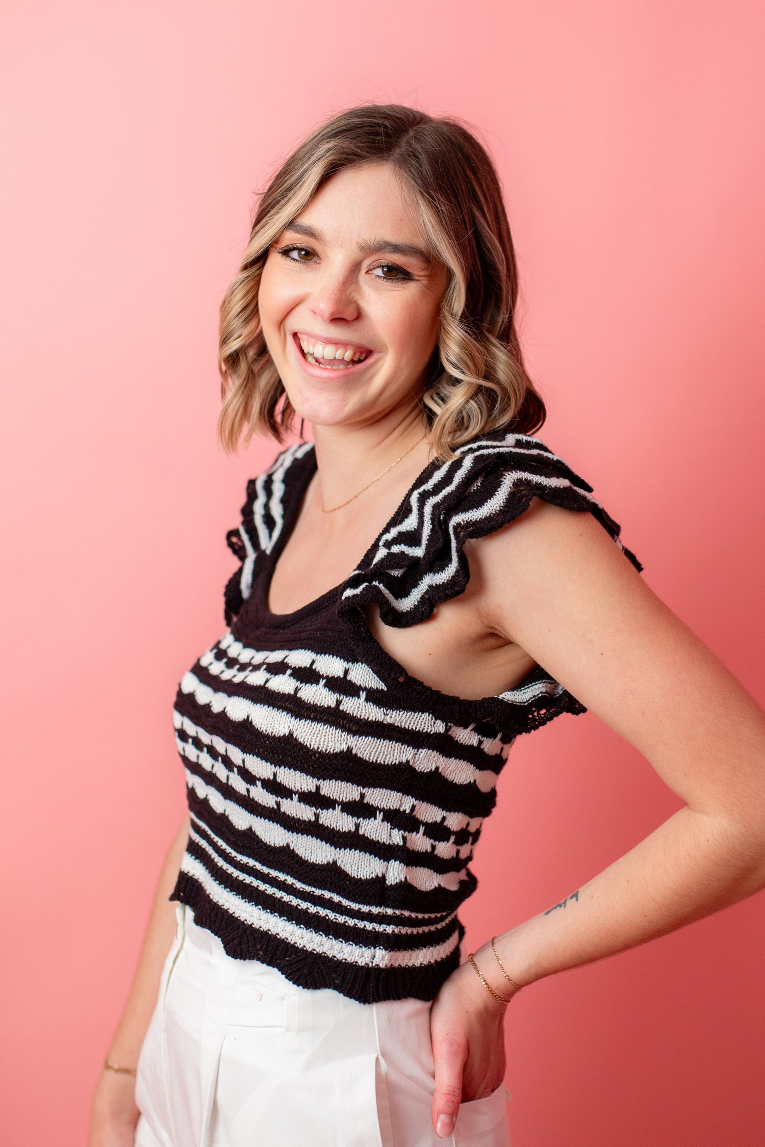 Stand out in this feminine cropped tank that features a bold textured stripe. We're loving the double ruffle sleeve detail that instantly elevates this fun top.